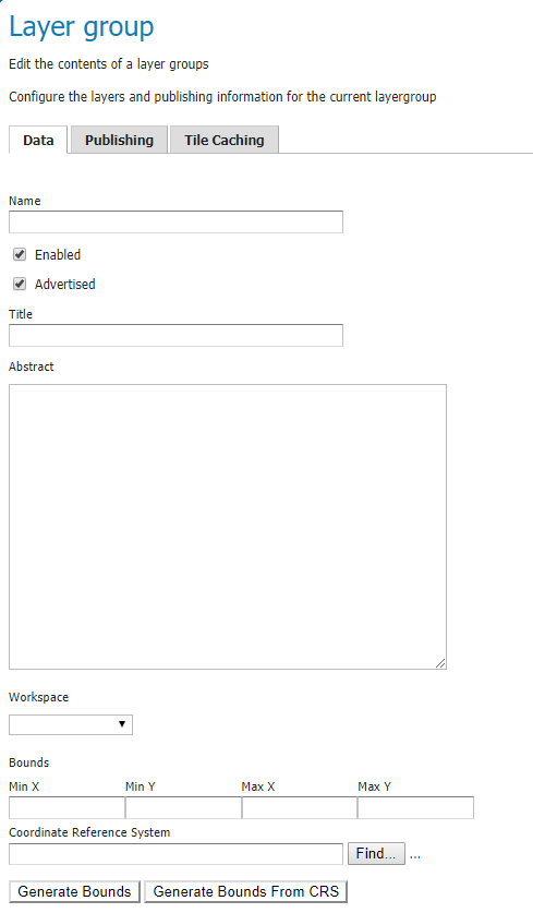 To view or edit a layer group, click the layer group name. A layer group configuration page will be displayed. The initial fields allow you to configure the name, title, abstract, workspace, bounds, projection and mode of the layer group. To automatically set the bounding box, select the Generate Bounds button or the Generate Bounds From CRS button to use the bounds defined in the CRS (if available). You may also provide your own custom bounding box extents. To select an appropriate projection click the Find button.