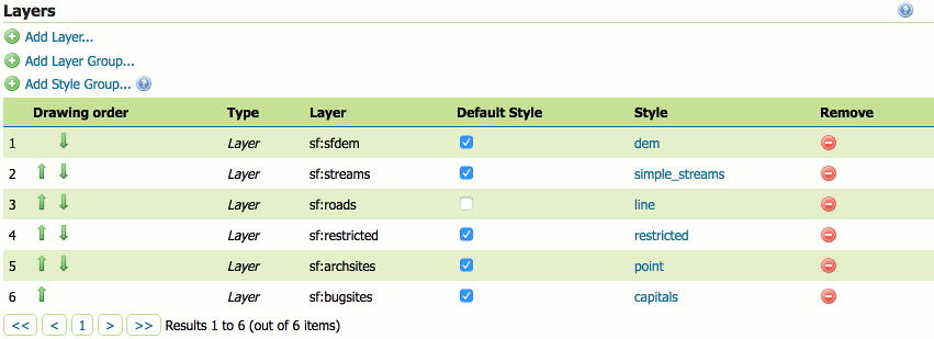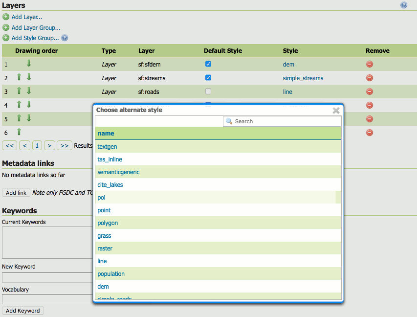 The Style column shows the style associated with each layer. To change the style associated with a layer, click the appropriate style link. A list of enabled styles will be displayed. Clicking on a style name reassigns the layer's style.