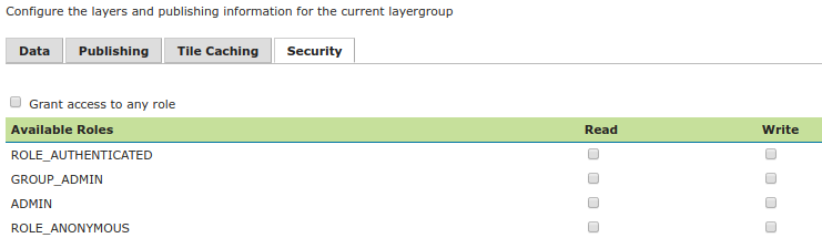 To create/edit layergroup's data access rules simply check/uncheck checkboxes according to desired access mode and role. The Grant access to any role checkbox grant each role for each access mode.