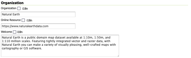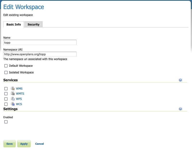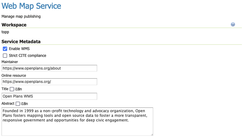 Once enabled clicking on the service link will open the settings page for the service, allowing default values for service title, abstract and other details to be supplied.