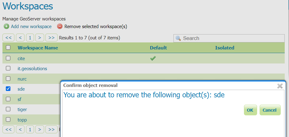To remove a workspace, select it by clicking the checkbox next to the workspace. Multiple workspaces can be selected, or all can be selected by clicking the checkbox in the header. Click the Remove selected workspaces(s) button. You will be asked to confirm or cancel the removal. Clicking OK removes the selected workspace(s).