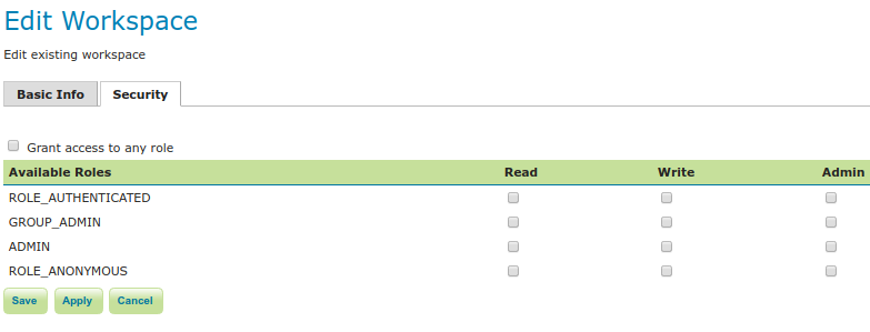 To create/edit the workspace's data access rules, check/uncheck checkboxes according to the desired role. The Grant access to any role checkbox grant each role for any access mode.
