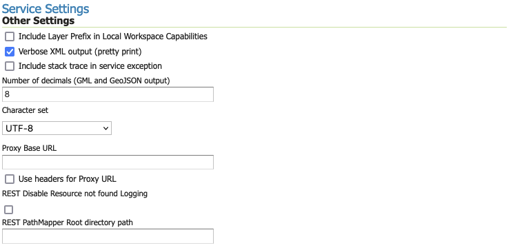 - Include Layer Prefix in Local Workspace Capabilities: Enable this setting to force the inclusion of the workspace name as a prefix when accessing workspace contents as a virtual web service. The layer