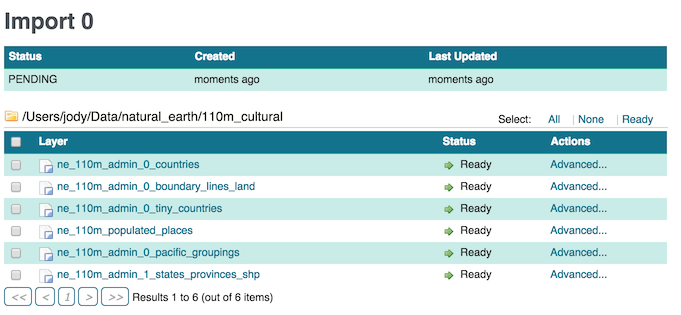 Recent import processes are listed at the bottom of the page. You may wish to visit these pages to check if any difficulties were encountered during the import process or import additional layers.