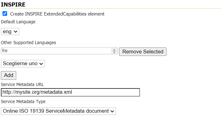 Once on the WFS or WCS configuration page, there will be a block titled INSPIRE. If you enable the checkbox shown above this section will have the following additional settings: