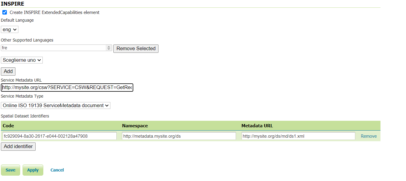- Spatial dataset identifiers table, where you can specify a code (mandatory), a namespace (optional) and a metadata URL (optional) for each spatial data set the WFS or WCS is offering