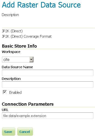 Once these steps have been completed, restart GeoServer. If done correctly, new data formats will be in the Raster Data Sources list when creating a new data store: