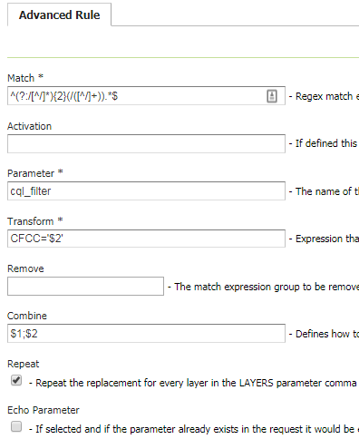 This module is configured by a set of rules that will be applied to the incoming URLs. Note that a get capabilities result will include the original URL maintaining the extra filter.