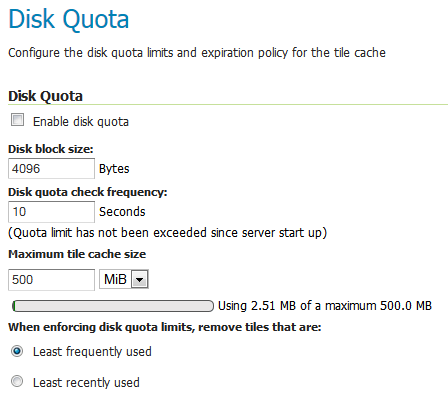 The Disk Quotas page manages the disk usage for cached tiles and allows you to set the global disk quota. Individual layer quotas can be set in the layer's properties page.