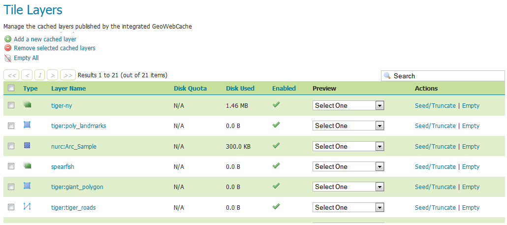 This page shows a listing of all of the layers known to the integrated GeoWebCache. It is similar to the Layer Preview for GeoWebCache, with many of the same options.