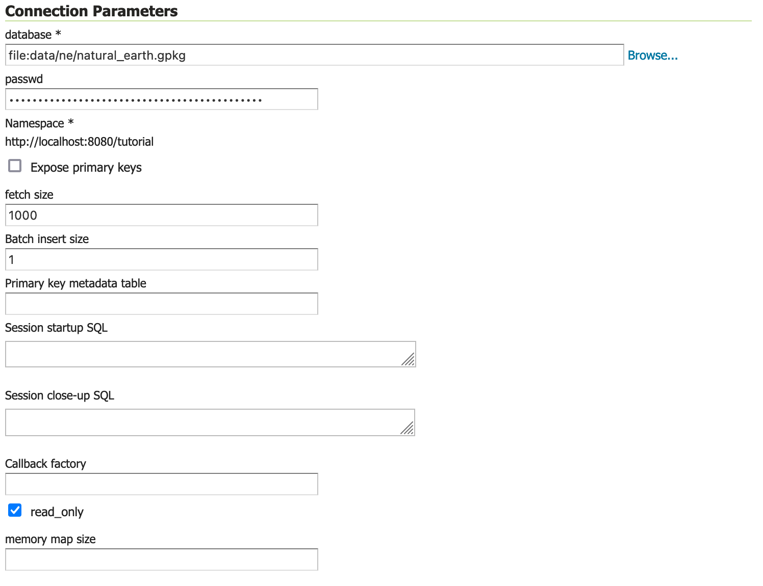 The use of read_only above indicates that we will not be writing to this GeoPackage, allowing GeoServer to avoid managing write locks when accessing this content for greater performance.