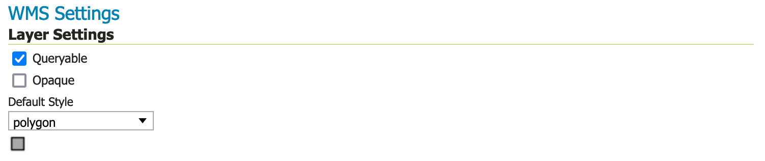 Locate the WMS Settings heading, where we can set the style.Ensure that the Default Style is set to `polygon``.