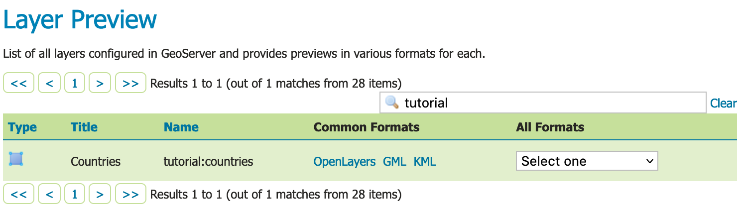 In order to verify that the tutorial:countries layer is published correctly, we can preview the layer.