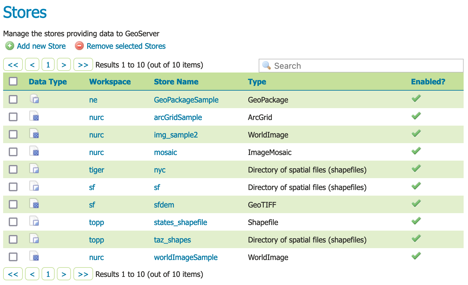 This page displays a list of stores, including the type of store and the workspace that the store belongs to.