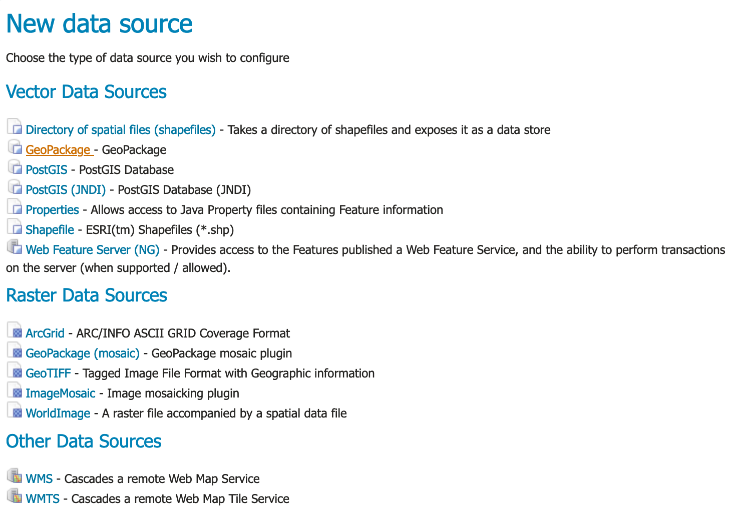 From the list of Vector Data Sources locate and click the GeoPackage link.