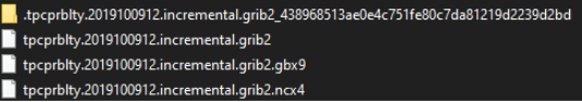 - The screenshot below represents an actual example of a tpcprblty.2019100912.incremental.grib2 file with related auxiliary/cache files