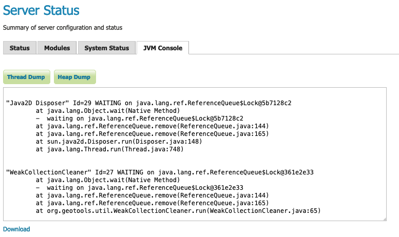 GeoServer provides a built-in JVM Console used to obtain: