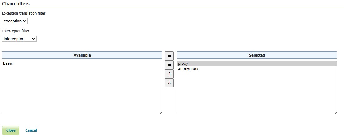 Click close at the bottom of the page and then click Save back on the Authentication page to save your filter chain changes.