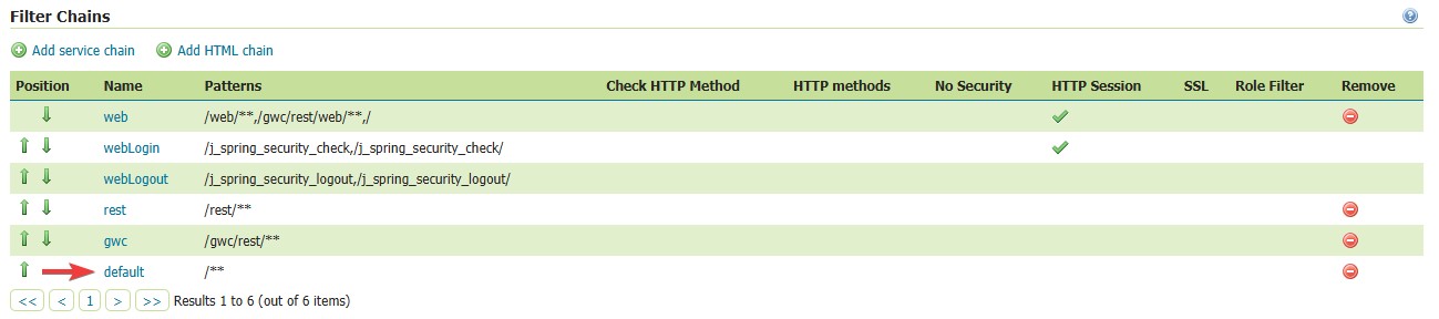 In order to test the authentication settings configured in the previous section a service or resource must be first secured. The Default filter chain is the chain applied to all OGC service requests so a service security rule must be configured.