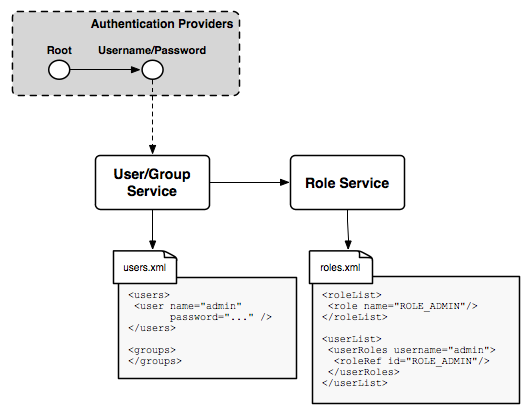 A single user/group service, which persist the user database as XML, is present. The database contains a single user named admin and no groups. Similarly, the role service persists the role database as XML. By default, this contains a single role named ADMIN, which is associated with the admin user. The ADMIN role is mapped to the ROLE_ADMINISTRATOR role and as a result, the admin user is associated with system administrator role during role calculation.