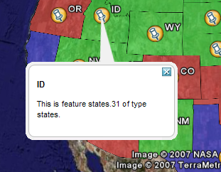 By default GeoServer produces placemark descriptions which are HTML tables describing all the attributes available for a particular feature in a dataset. In the following image we see the placemark description for the feature representing Idaho state: