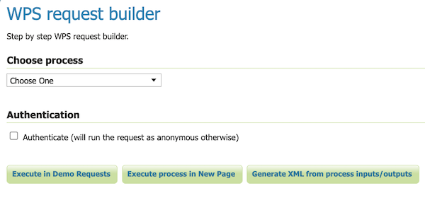 The WPS Request Builder primarily consists of a selection box listing all of the available processes, and two buttons, one to submit the WPS request, and another to display what the POST request looks like.
