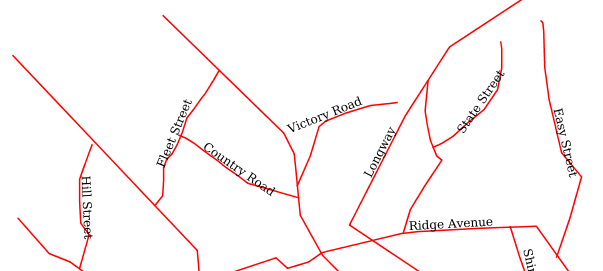 This example paints lines with a red stroke, and then adds horizontal black labels at the center of the line, using the "name" attribute to fill the label.