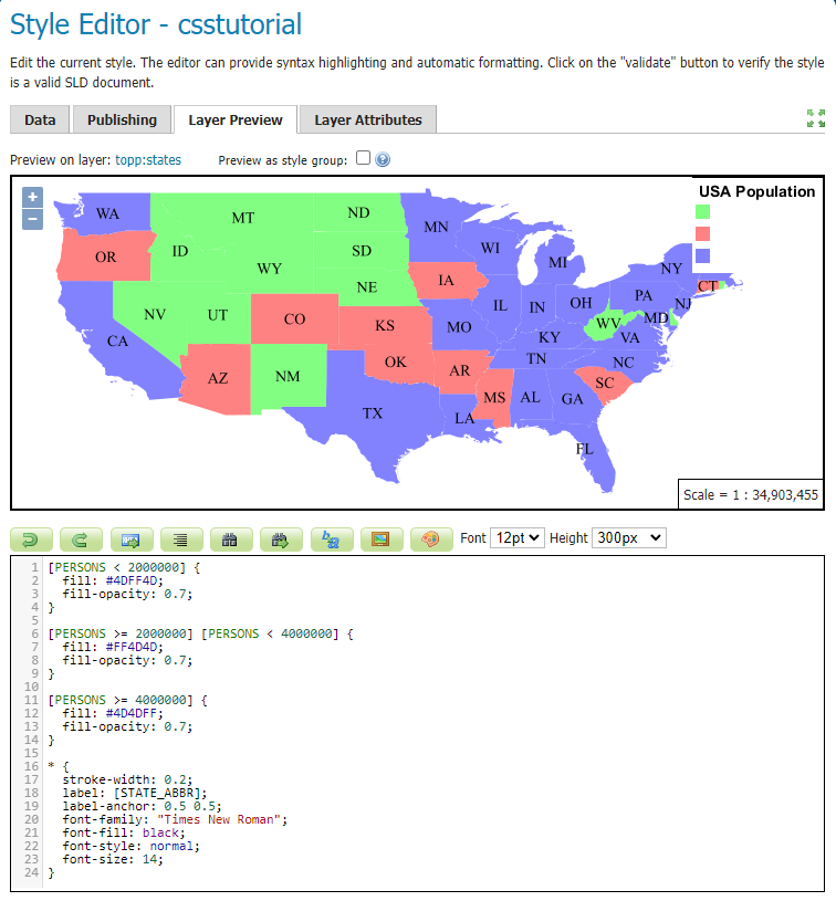 This tutorial will show using CSS to style a layer, along with the equivalent SLD code.