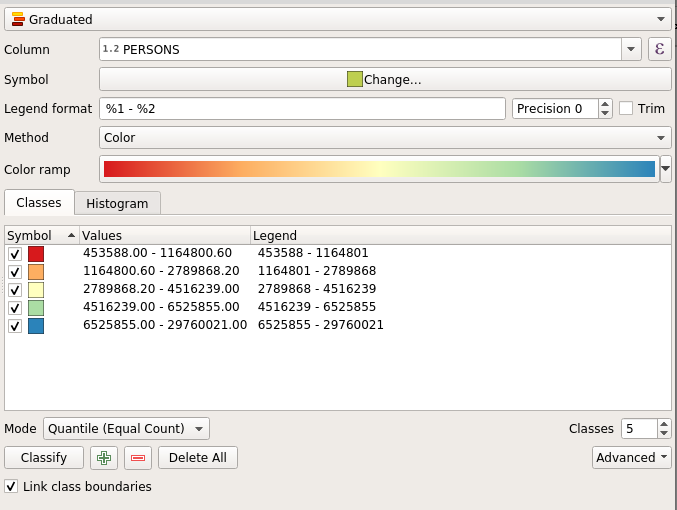 Graduatedrendering, on thePERSONScolumn, and click on Classify button to generate1.5standard deviations, select thespectralcolor ramp, switch mode toQuantileand finally and click on the Classify button to generate a 5 classes map, as shown in figure.