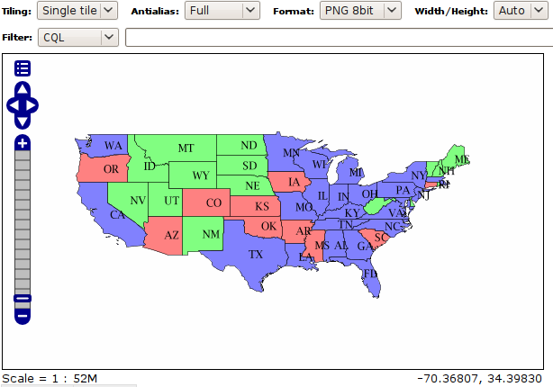 The following examples use the topp:states sample layer shipped with GeoServer. They demonstrate how CQL filters work by using the WMS CQL_FILTER vendor parameter to alter the data displayed by WMS requests. The easiest way to follow the tutorial is to open the GeoServer Map Preview for the topp:states layer. Click on the Options button at the top of the map preview to open the advanced options toolbar. The example filters can be entered in the Filter: CQL box.